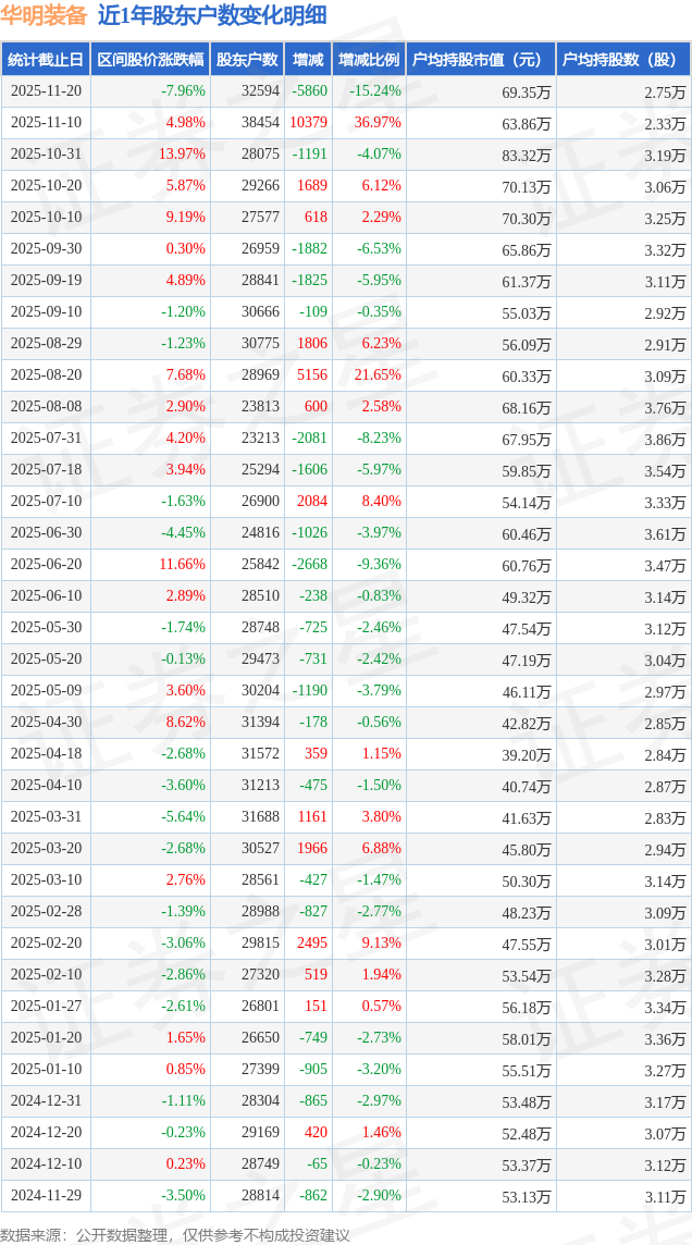 从股价来看,2025年11月10日至2025年11月20日,华明装备区间跌幅为7.96%,在此期间股东户数减少5860.0户,减幅为15.24%。