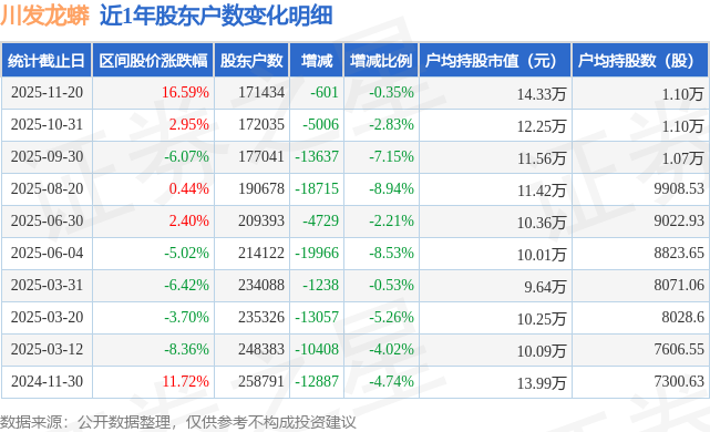 从股价来看,2025年10月31日至2025年11月20日,川发龙蟒区间涨幅为16.59%,在此期间股东户数减少601.0户,减幅为0.35%。