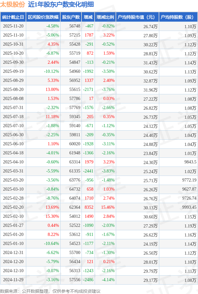 从股价来看,2025年11月10日至2025年11月20日,太极股份区间跌幅为4.58%,在此期间股东户数减少467.0户,减幅为0.82%。