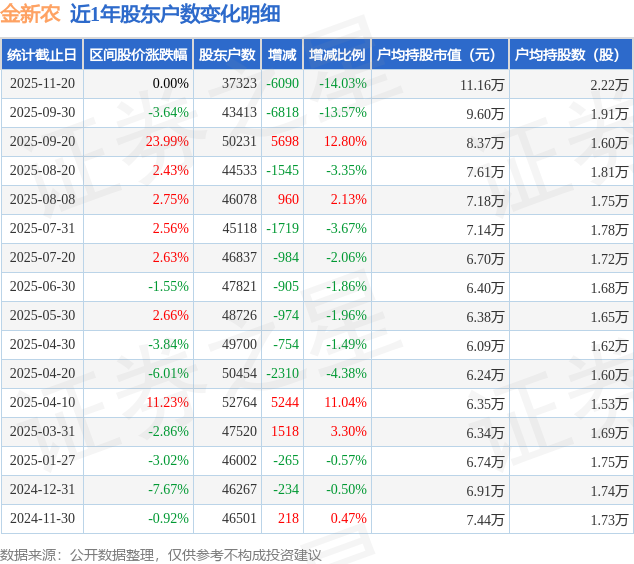 从股价来看,2025年9月30日至2025年11月20日,金新农区间跌幅为0.0%,在此期间股东户数减少6090.0户,减幅为14.03%。