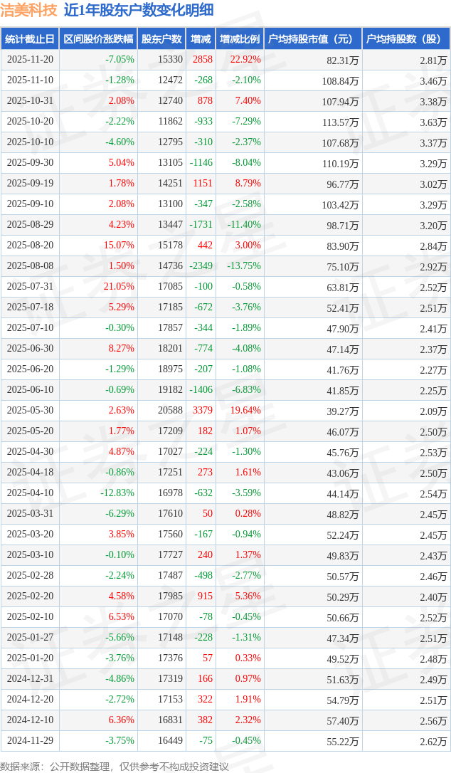 从股价来看,2025年11月10日至2025年11月20日,洁美科技区间跌幅为7.05%,在此期间股东户数增加2858.0户,增幅为22.92%。