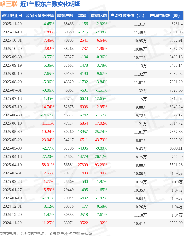 从股价来看,2025年11月10日至2025年11月20日,哈三联区间跌幅为4.45%,在此期间股东户数减少1156.0户,减幅为2.92%。