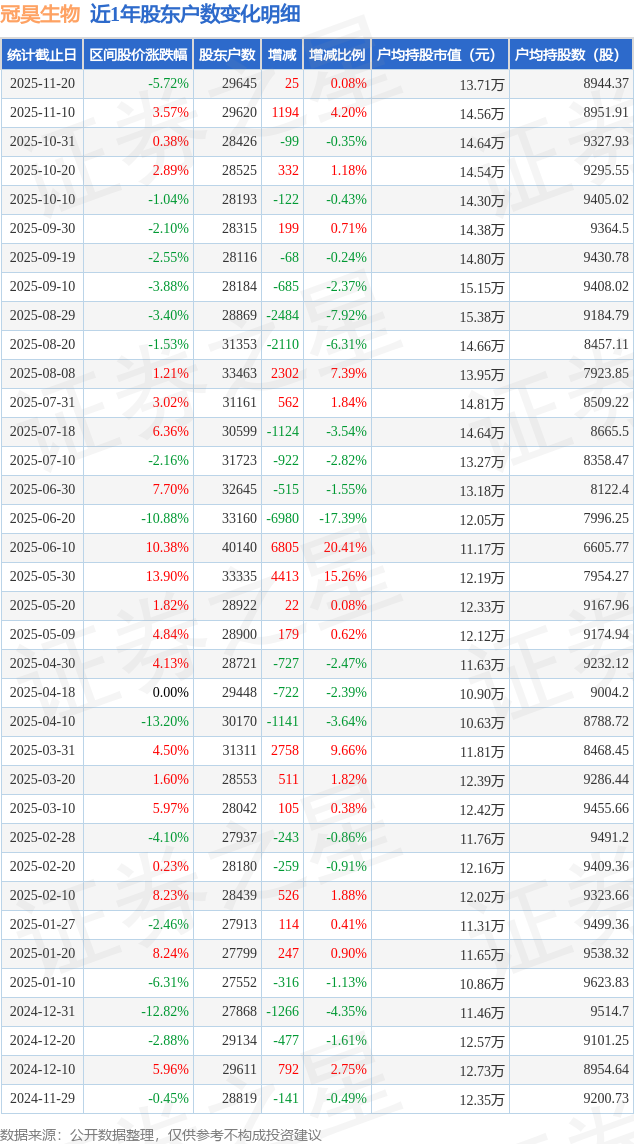 从股价来看,2025年11月10日至2025年11月20日,冠昊生物区间跌幅为5.72%,在此期间股东户数增加25.0户,增幅为0.08%。