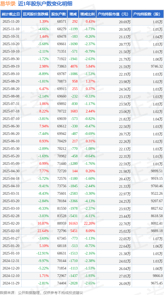 从股价来看,2025年11月10日至2025年11月20日,易华录区间涨幅为1.39%,在此期间股东户数增加292.0户,增幅为0.43%。