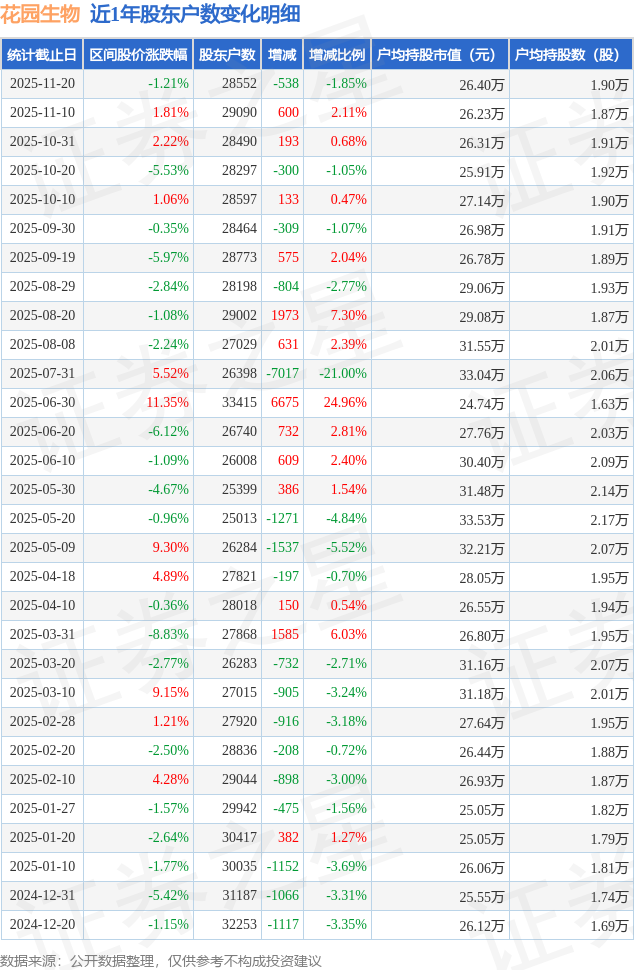 从股价来看,2025年11月10日至2025年11月20日,花园生物区间跌幅为1.21%,在此期间股东户数减少538.0户,减幅为1.85%。