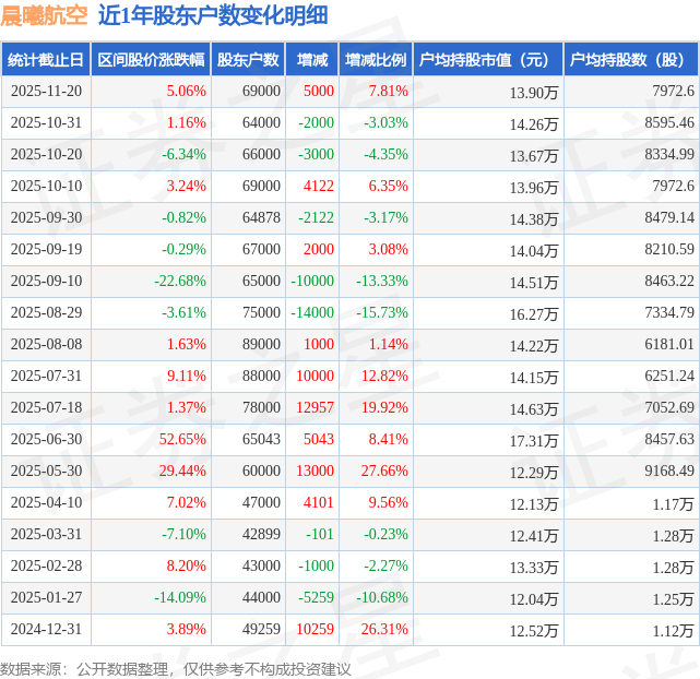 从股价来看,2025年10月31日至2025年11月20日,晨曦航空区间涨幅为5.06%,在此期间股东户数增加5000.0户,增幅为7.81%。
