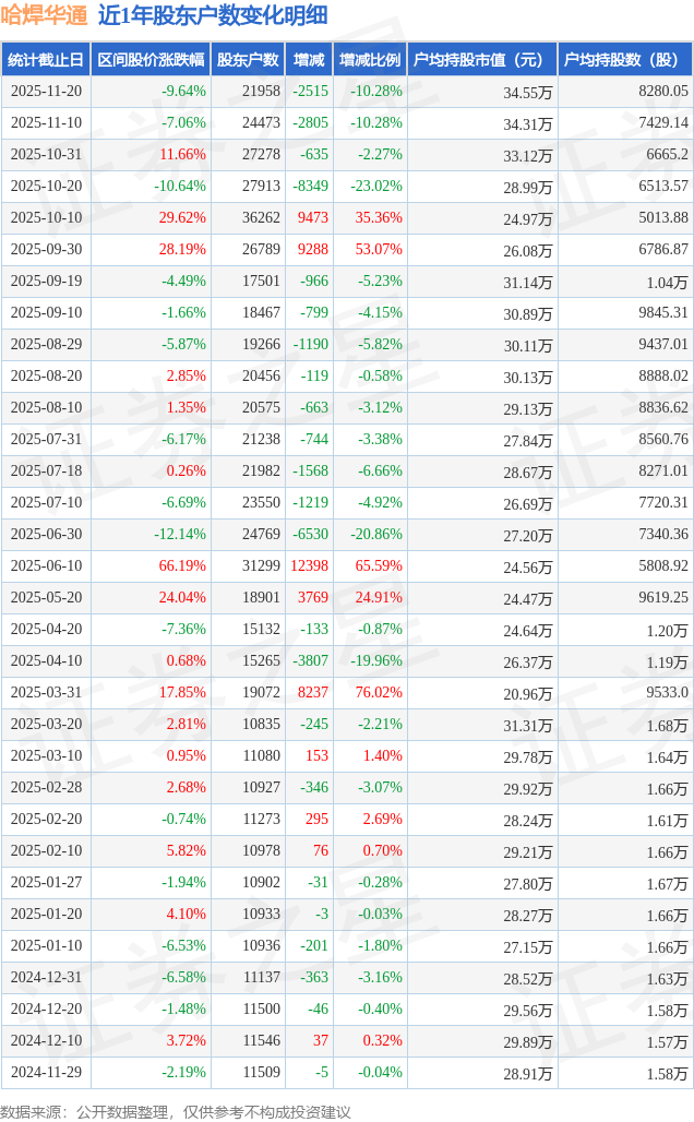 从股价来看,2025年11月10日至2025年11月20日,哈焊华通区间跌幅为9.64%,在此期间股东户数减少2515.0户,减幅为10.28%。