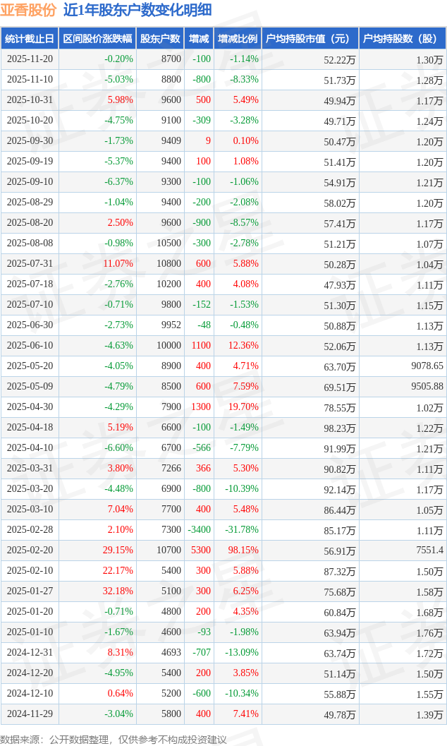 从股价来看,2025年11月10日至2025年11月20日,亚香股份区间跌幅为0.2%,在此期间股东户数减少100.0户,减幅为1.14%。