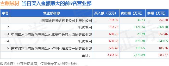 证券之星消息,沪深交易所2025年11月24日公布的交易公开信息显示,古麒绒材(001390)因日换手率达到20%的前5只证券登上龙虎榜。此次是近5个交易日内第4次上榜。