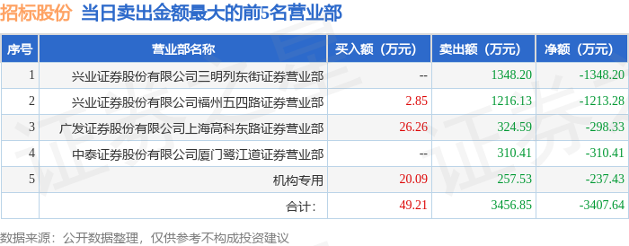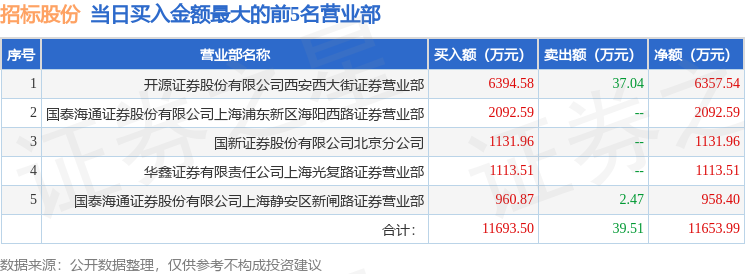 证券之星消息,沪深交易所2025年11月24日公布的交易公开信息显示,招标股份(301136)因日涨幅达到15%的前5只证券登上龙虎榜。此次是近5个交易日内第1次上榜。