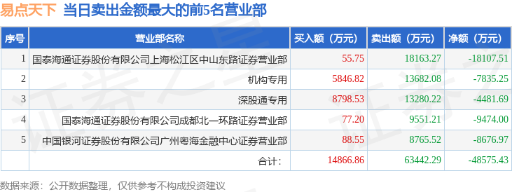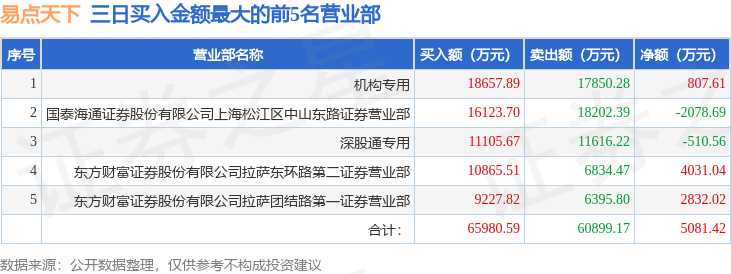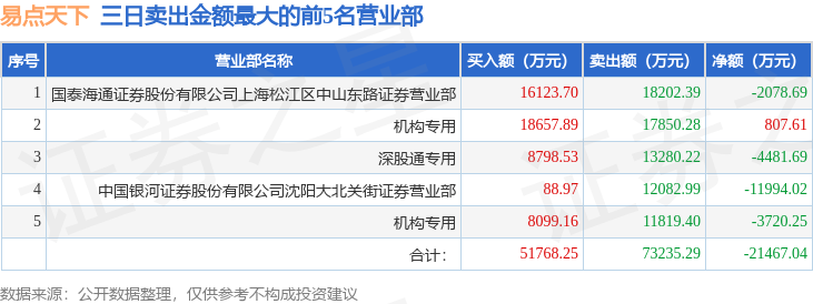 从龙虎榜公布的三日买卖数据来看,机构合计净卖出2912.64万元,北向资金合计净卖出4992.25万元。上海中山东路、陈小群等知名游资榜上有名。(知名游资上海中山东路一般指国泰海通证券股份有限公司上海松江区中山东路证券营业部席位、知名游资上海中山东路一般指国泰海通证券股份有限公司上海松江区中山东路证券营业部席位、知名游资陈小群一般指中国银河证券股份有限公司沈阳大北关街证券营业部席位,根据市场资料整理,仅供参考)
