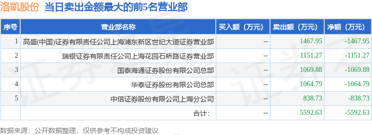 证券之星消息,沪深交易所2025年11月24日公布的交易公开信息显示,洛凯股份(603829)因有价格涨跌幅限制的日收盘价格跌幅偏离值达到7%的前五只证券登上龙虎榜。此次是近5个交易日内第3次上榜。