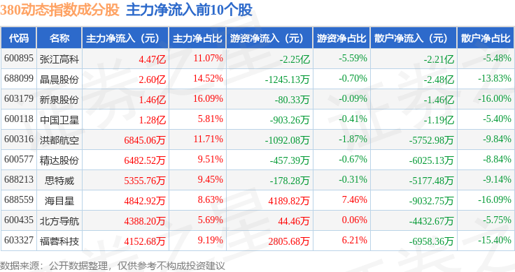 资金流向方面,380动态(000141)指数成份股当日主力资金净流出合计3.16亿元,游资资金净流出合计3.19亿元,散户资金净流入合计6.36亿元。成份股资金流向详情见下表: