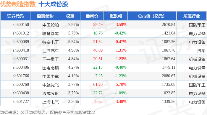 证券之星消息,11月24日,优势制造(000146)指数报收于7423.23点,涨1.33%,成交486.04亿元,换手率1.37%。当日该指数成份股中,上涨的有33家,中航沈飞以5.7%的涨幅领涨,下跌的有16家,璞泰来以2.08%的跌幅领跌。