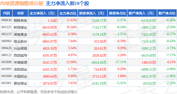 资金流向方面,内地资源(000944)指数成份股当日主力资金净流出合计15.45亿元,游资资金净流入合计1490.35万元,散户资金净流入合计15.31亿元。成份股资金流向详情见下表: