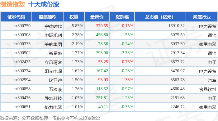 制造指数(399233)十大成份股详情如下: