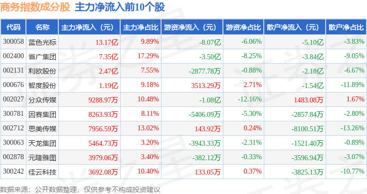 资金流向方面,商务指数(399242)成份股当日主力资金净流入合计25.62亿元,游资资金净流出合计13.77亿元,散户资金净流出合计11.86亿元。成份股资金流向详情见下表: