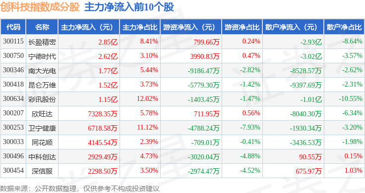 资金流向方面,创科技(399276)指数成份股当日主力资金净流出合计14.6亿元,游资资金净流入合计15.91亿元,散户资金净流出合计1.31亿元。成份股资金流向详情见下表: