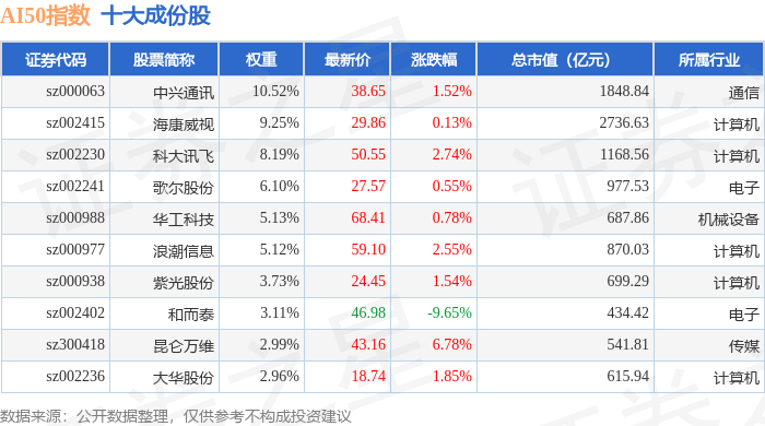 AI50(399284)指数十大成份股详情如下: