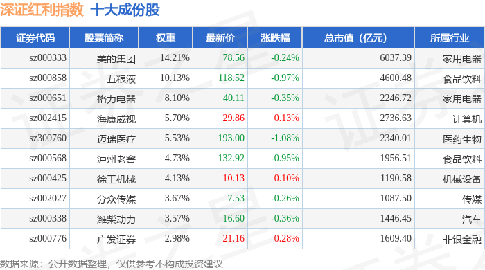 证券之星消息,11月24日,深证红利(399324)指数报收于8962.36点,跌0.11%,成交275.69亿元,换手率0.88%。当日该指数成份股中,上涨的有23家,索菲亚以4.19%的涨幅领涨,下跌的有17家,藏格矿业以2.09%的跌幅领跌。
