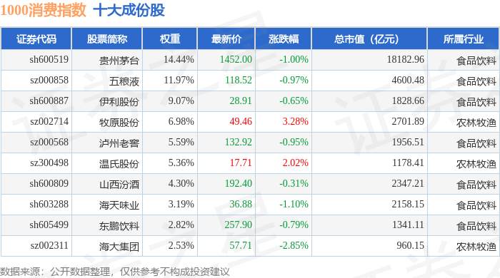 证券之星消息,11月24日,1000消费(399385)指数报收于9710.44点,跌0.21%,成交266.15亿元,换手率0.99%。当日该指数成份股中,上涨的有27家,牧原股份以3.28%的涨幅领涨,下跌的有26家,海大集团以2.85%的跌幅领跌。