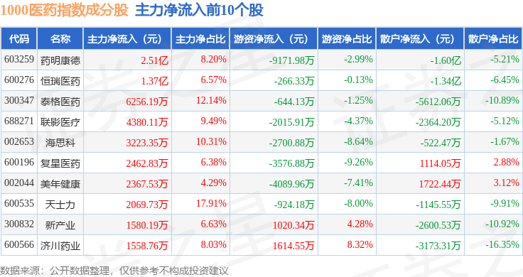 资金流向方面,1000医药(399386)指数成份股当日主力资金净流出合计3.08亿元,游资资金净流出合计1.13亿元,散户资金净流入合计4.16亿元。成份股资金流向详情见下表: