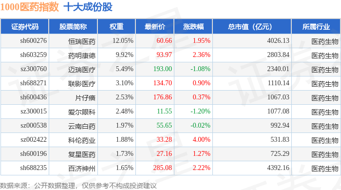 1000医药(399386)指数十大成份股详情如下: