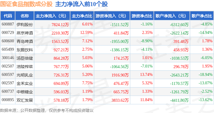 资金流向方面,国证食品(399396)指数成份股当日主力资金净流出合计8.52亿元,游资资金净流入合计5.06亿元,散户资金净流入合计3.46亿元。成份股资金流向详情见下表: