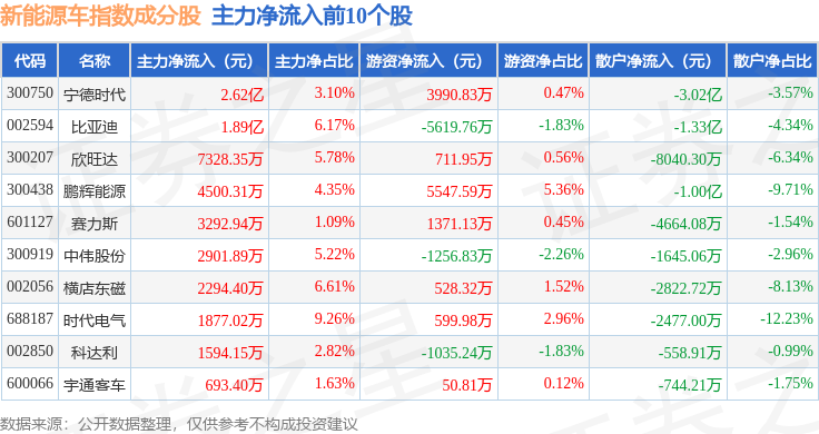 资金流向方面,新能源车(399417)指数成份股当日主力资金净流出合计27.57亿元,游资资金净流入合计2.08亿元,散户资金净流入合计25.46亿元。成份股资金流向详情见下表: