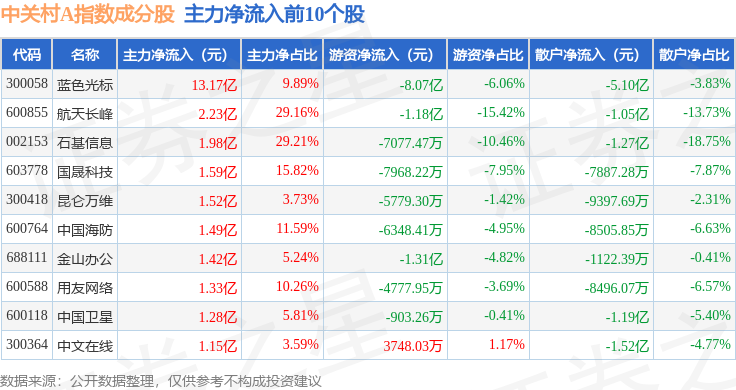 资金流向方面,中关村A(399422)指数成份股当日主力资金净流入合计7.23亿元,游资资金净流出合计19.13亿元,散户资金净流入合计12.51亿元。成份股资金流向详情见下表: