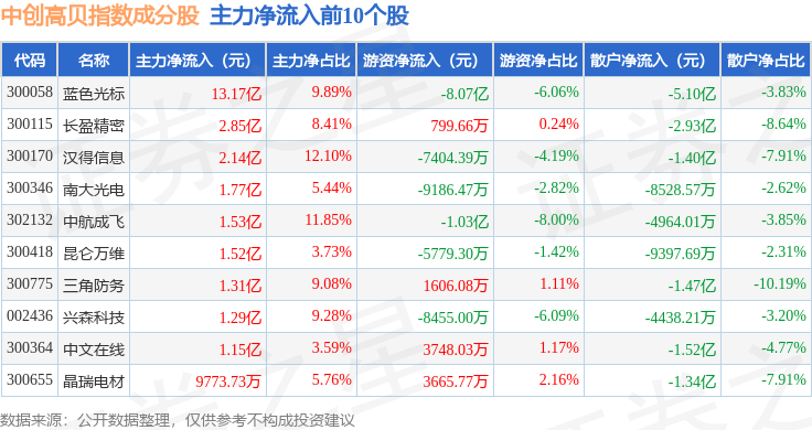 资金流向方面,中创高贝(399666)指数成份股当日主力资金净流出合计51.9亿元,游资资金净流入合计12.08亿元,散户资金净流入合计39.82亿元。成份股资金流向详情见下表: