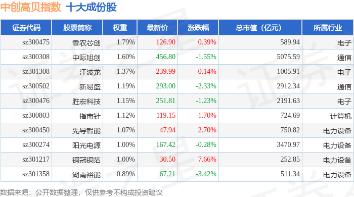 证券之星消息,11月24日,中创高贝(399666)指数报收于1892.41点,涨1.52%,成交2510.59亿元,换手率3.96%。当日该指数成份股中,上涨的有162家,蓝色光标以15.72%的涨幅领涨,下跌的有38家,江特电机以8.98%的跌幅领跌。