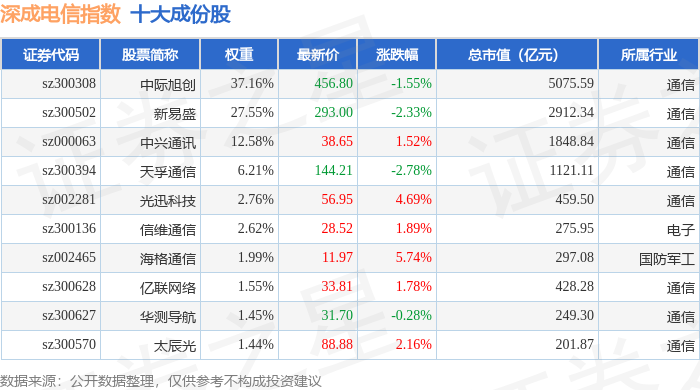 证券之星消息,11月24日,深成电信(399688)指数报收于5076.43点,跌0.71%,成交502.86亿元,换手率3.18%。当日该指数成份股中,上涨的有11家,海格通信以5.74%的涨幅领涨,下跌的有4家,天孚通信以2.78%的跌幅领跌。