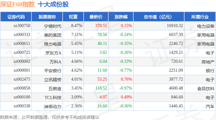 证券之星消息,11月24日,深证F60(399701)指数报收于7849.13点,跌0.19%,成交675.89亿元,换手率0.8%。当日该指数成份股中,上涨的有27家,牧原股份以3.28%的涨幅领涨,下跌的有31家,天齐锂业以8.01%的跌幅领跌。