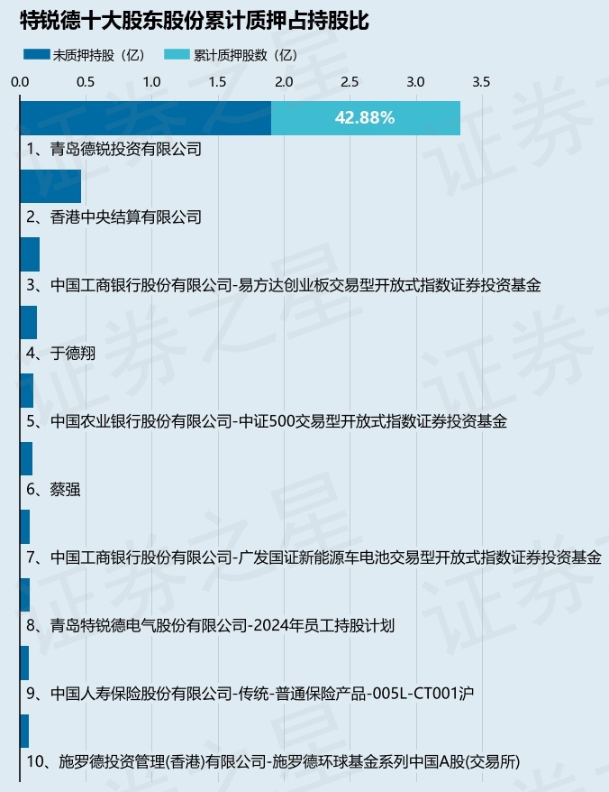 截止本公告日,股东青岛德锐投资有限公司已累计质押股份1.43亿股,占其持股总数的42.88%。本次质押后特锐德十大股东的累计质押股份占持股比例(占持股比例的计算以公司最新一期财务报表公布的十大股东的持股总数为基准)见下图: