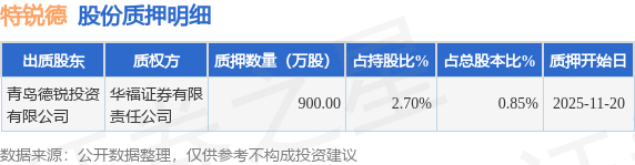 证券之星消息,特锐德(300001)11月24日公开信息显示,股东青岛德锐投资有限公司向华福证券有限责任公司合计质押900.0万股,占总股本0.85%。质押详情见下表: