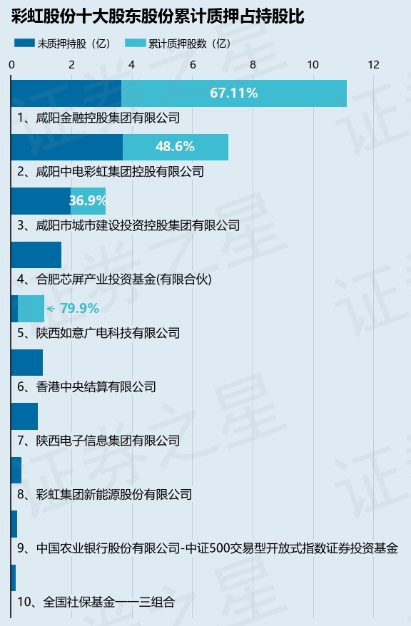 截止本公告日,股东咸阳金融控股集团有限公司已累计质押股份7.47亿股,占其持股总数的67.11%,股东咸阳中电彩虹集团控股有限公司已累计质押股份3.5亿股,占其持股总数的48.6%,股东咸阳市城市建设投资控股集团有限公司已累计质押股份1.16亿股,占其持股总数的36.9%,股东陕西如意广电科技有限公司已累计质押股份8700.0万股,占其持股总数的79.9%。本次质押后彩虹股份十大股东的累计质押股份占持股比例(占持股比例的计算以公司最新一期财务报表公布的十大股东的持股总数为基准)见下图: