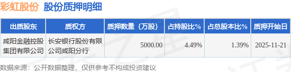 证券之星消息,彩虹股份(600707)11月24日公开信息显示,股东咸阳金融控股集团有限公司向长安银行股份有限公司咸阳分行合计质押5000.0万股,占总股本1.39%。质押详情见下表:
