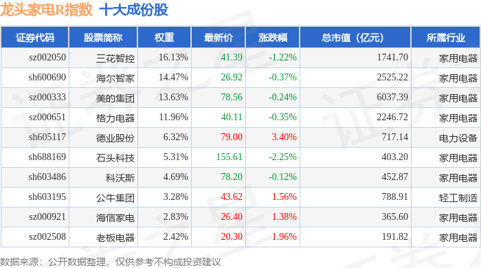 龙头家电R(480028)指数十大成份股详情如下: