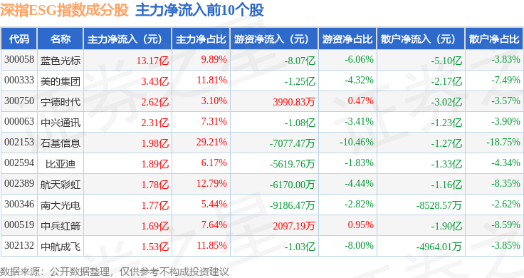 资金流向方面,深指ESG(970026)指数成份股当日主力资金净流出合计55.08亿元,游资资金净流入合计2004.4万元,散户资金净流入合计54.88亿元。成份股资金流向详情见下表: