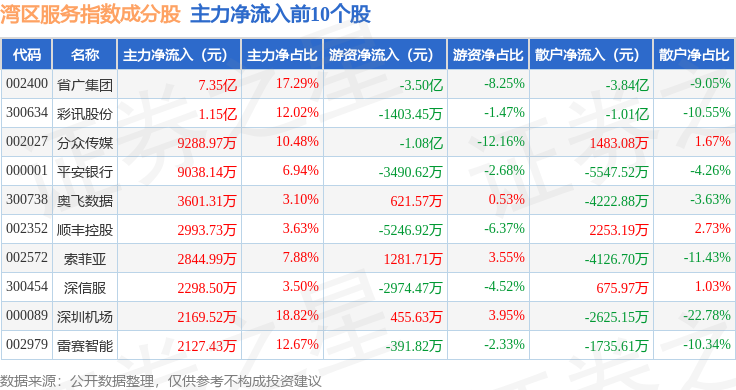 资金流向方面,湾区服务(980011)指数成份股当日主力资金净流入合计4.95亿元,游资资金净流出合计6.6亿元,散户资金净流入合计1.65亿元。成份股资金流向详情见下表: