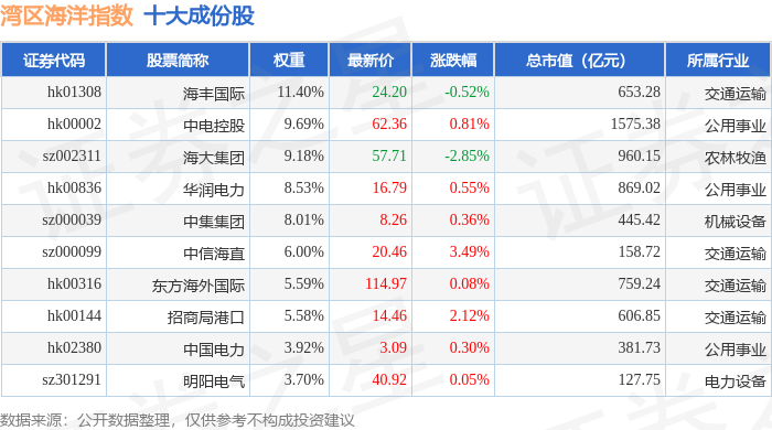 湾区海洋(980019)指数十大成份股详情如下:
