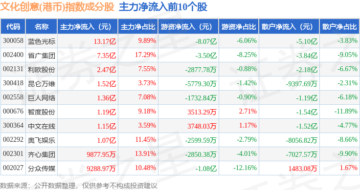 资金流向方面,文化创意(港币)(980047)指数成份股当日主力资金净流入合计32.18亿元,游资资金净流出合计16.75亿元,散户资金净流出合计15.43亿元。成份股资金流向详情见下表: