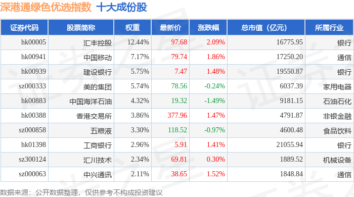 深港通绿色优选(983011)指数十大成份股详情如下: