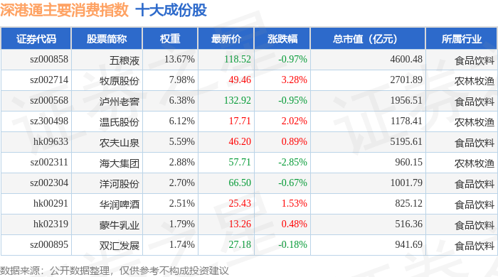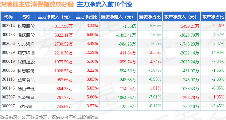 资金流向方面,深港通主要消费(983021)指数成份股当日主力资金净流出合计6.51亿元,游资资金净流入合计2.03亿元,散户资金净流入合计4.48亿元。成份股资金流向详情见下表: