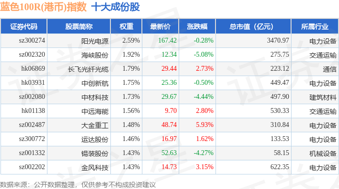 蓝色100R(港币)(480069)指数十大成份股详情如下: