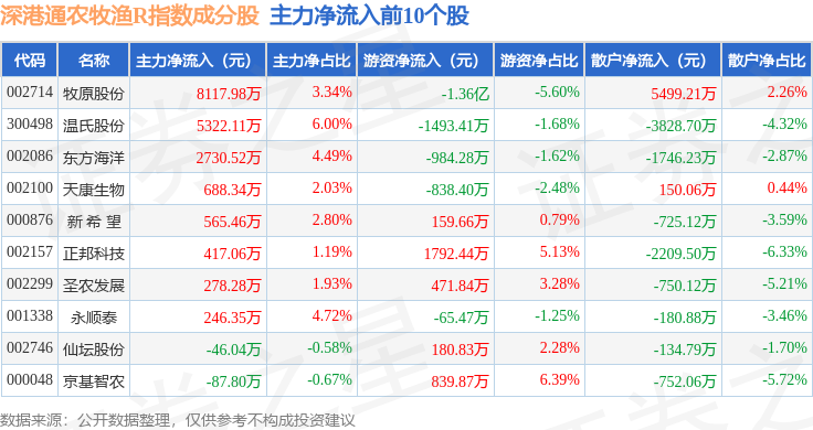 资金流向方面,深港通农牧渔R(483051)指数成份股当日主力资金净流出合计8957.8万元,游资资金净流出合计6067.5万元,散户资金净流入合计1.5亿元。成份股资金流向详情见下表: