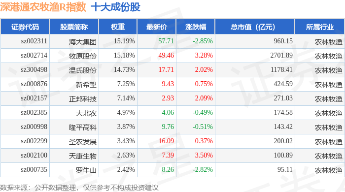 深港通农牧渔R(483051)指数十大成份股详情如下: