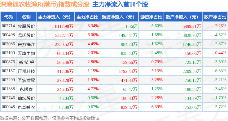 资金流向方面,深港通农牧渔R(港币)(483052)指数成份股当日主力资金净流出合计8957.8万元,游资资金净流出合计6067.5万元,散户资金净流入合计1.5亿元。成份股资金流向详情见下表: