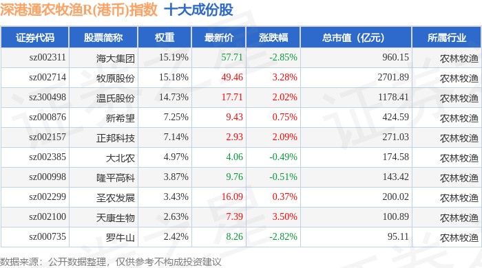 深港通农牧渔R(港币)(483052)指数十大成份股详情如下: